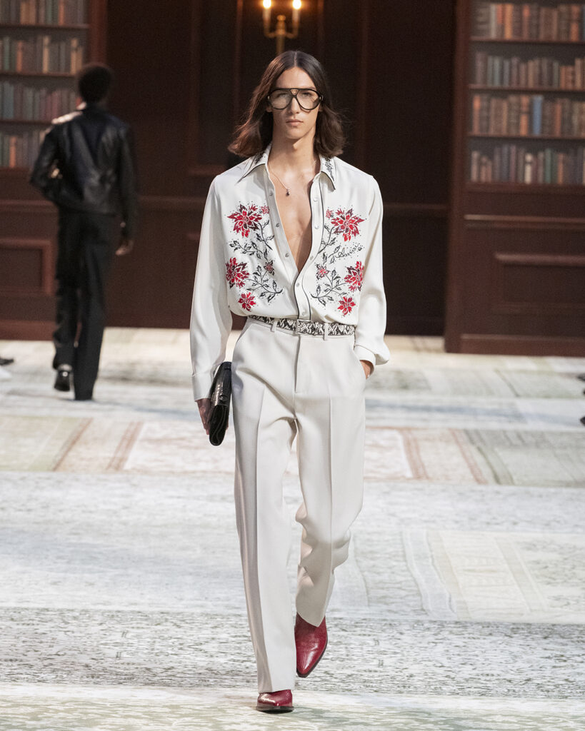 This interchangeability is uniquely Amiri, along with continuation of other signatures. The Honey and East-West Pouchette clutch reappear and form the fluency of the collection. The star of the show lies in Amiri’s western boots, a playful element that has become synonymous with the brand. The expertise travels throughout the collection, this boot being a sentiment of the strong storytelling that this show continues upon.