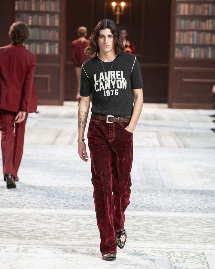The show nods to Laurel Canyon, home of rockstars in the 1970s. In true rockstar fashion leather takes centerstage contrasted by detailed embroidery that inspires a closer look. The designer uses texture in a distinguishing manner, velvet dances with leather and is paired with denim. Quite a few pieces standout for their color, a peachy suit and a sky blue leather jacket. The Amiri signature is anything but basic, Mike Amiri’s vision has the ability to make retro unbelievably sexy and a mint green three piece suit cool. The show maps a love story, clothes traveling across gender and between parties.