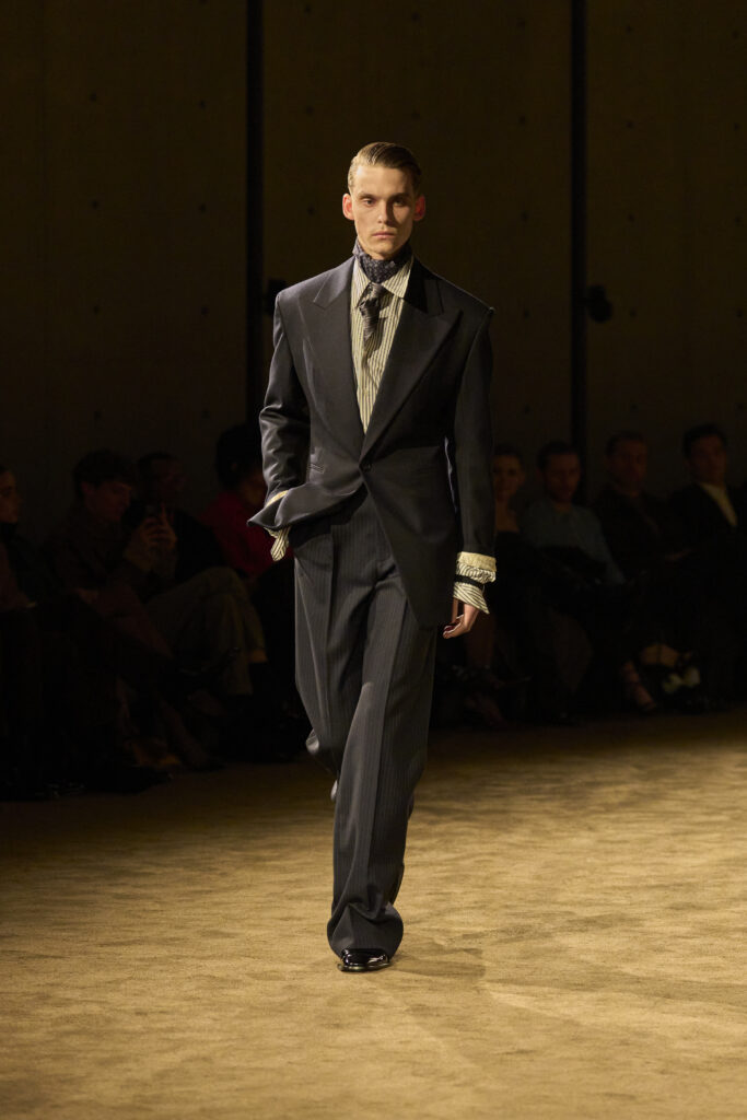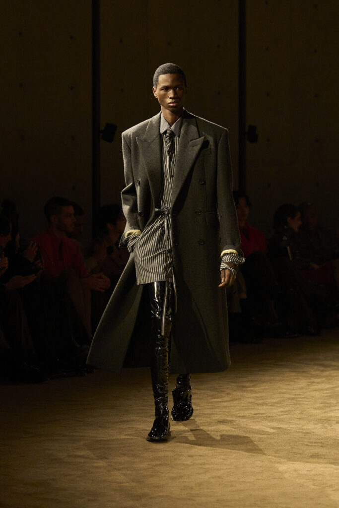 This tension is expressed through a lean, controlled silhouette. Soft, crumpled textures suggest wear and use, while sharp shoulders provide structure without eliminating vulnerability. Skin is revealed and concealed in measured ways, creating an eroticism that remains restrained. The house’s signature smoking appears almost protective in its construction, while high boots ground the look, reinforcing a sense of stability and presence.