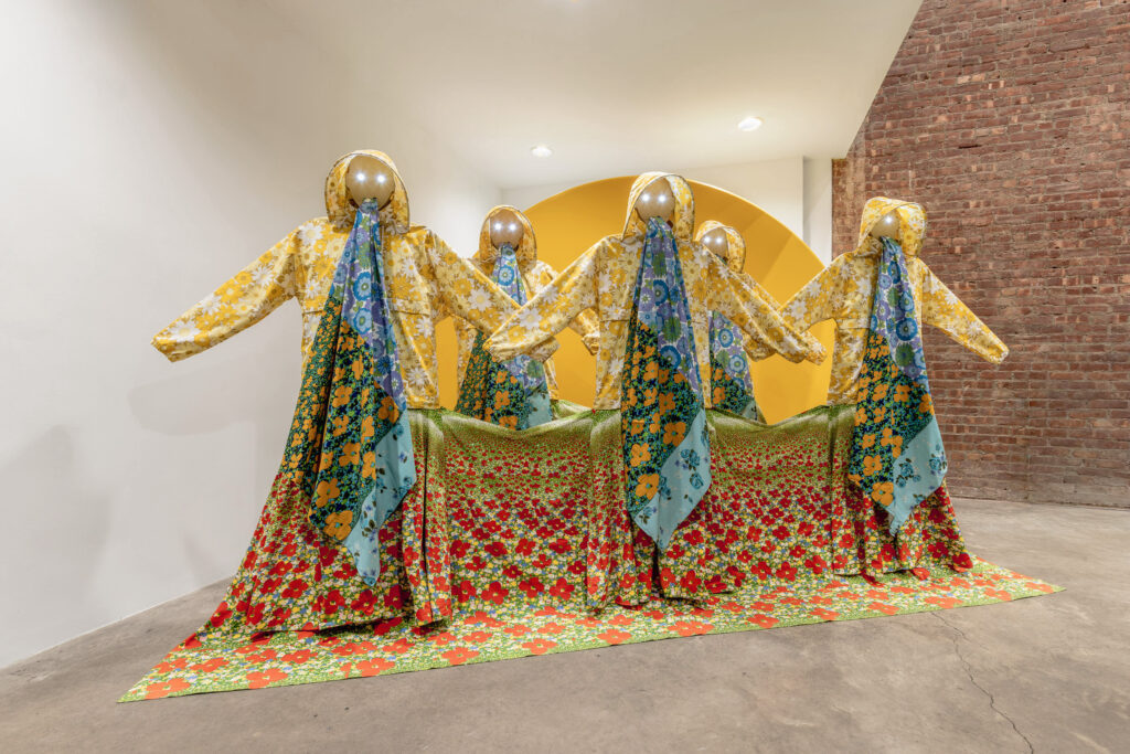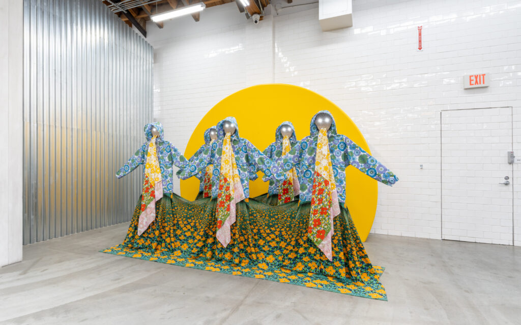 Since last week, five figures with piercing, glowing eyes have appeared at the corners of Dover Street Market New York and Los Angeles. The surreal models, draped in a bold cacophony of floral-printed garments, stand guard over the space, set against a buttery yellow backdrop that reads like a perpetual sunrise.