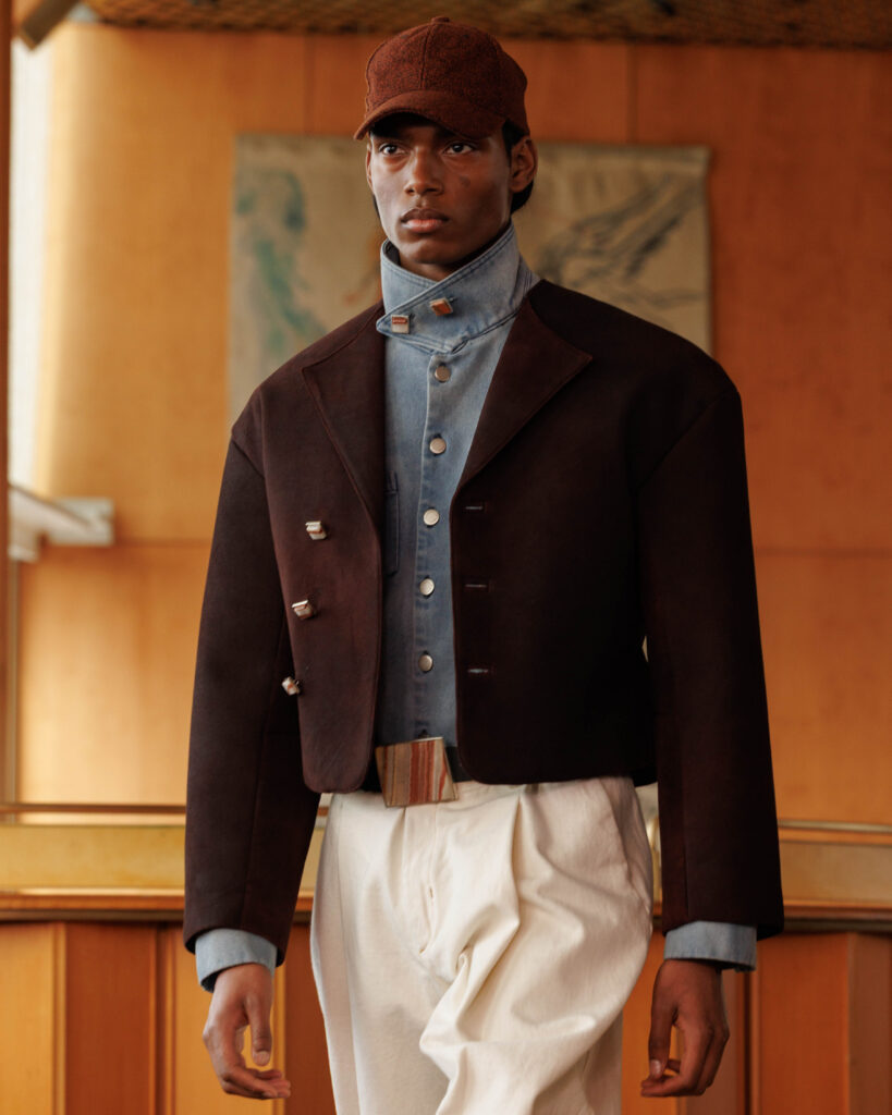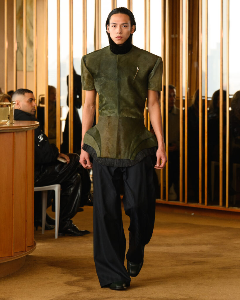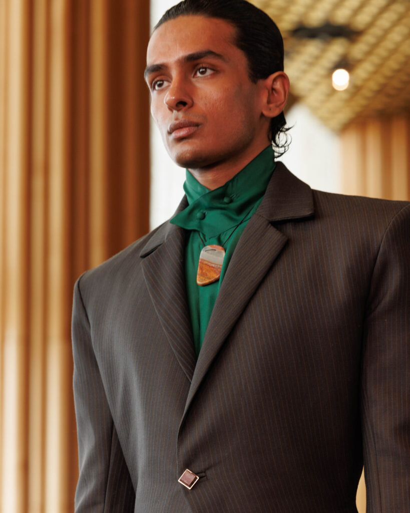 Sculpted T-shirts and button-downs came accented with sharp shoulders, while layered vests hugged the torso like sartorial armor. Suits and trousers were carefully pinched into controlled volumes, their structure offset by jewel-toned silks and rich suede that shimmered in between the draped layers. Geometric buttons added a playful punctuation, silver brooches unfurled across the chest, and smooth stone charms swung from the neck.