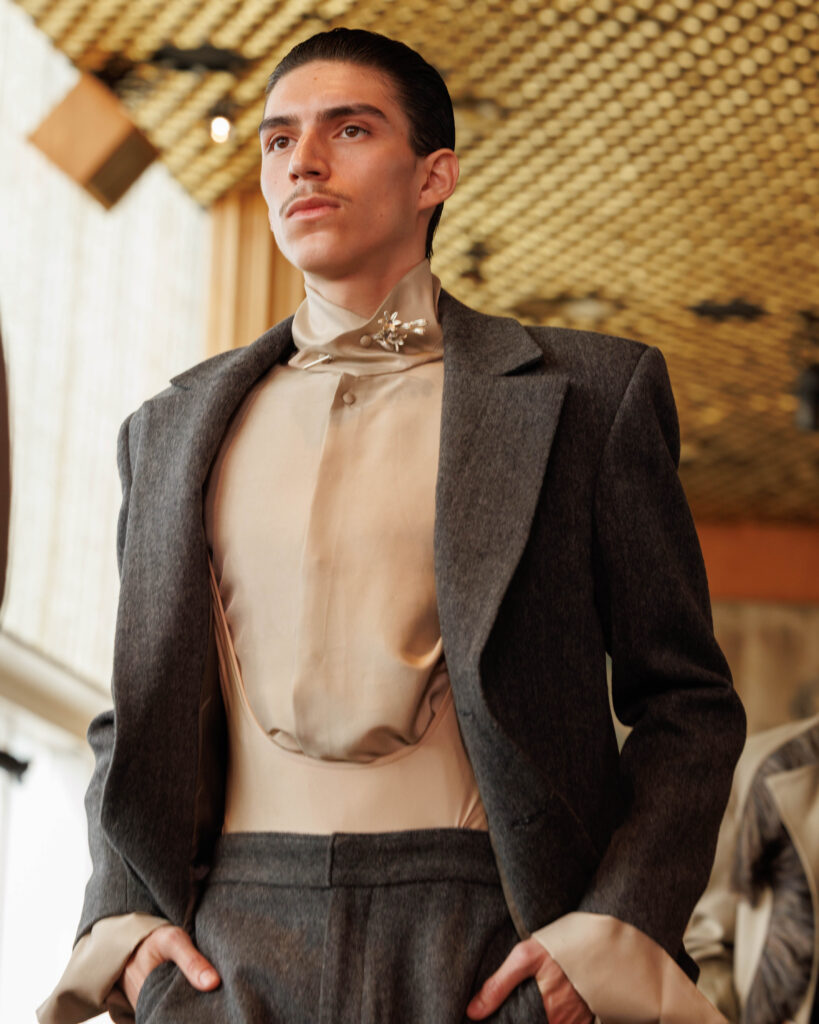 Drawing on charro-inspired tailoring, the collection translated Mexico-rooted crafts into sharp, contemporary wear. Sweeping plumes of horse-hair trim peeked from the hem of a sculptural waist-wrapping skirt and traced the front edges of tailored jackets. Examining how clothing constructs our identity and reshapes our body, the looks actively experimented with silhouettes—how they redirect our movements and alter the space we occupy.