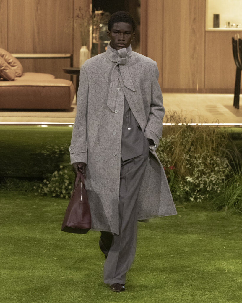The collection was structured around what Louis Vuitton describes as “Timeless Textiles.” These materials were developed in-house by the Studio Homme to prioritize durability, adaptability, and performance. As for traditional menswear fabrics, houndstooth, herringbone, and checks are re-engineered with technical yarns that reflect light. Likewise, silk and chambray shell jackets are constructed with membranes that make them waterproof or water-repellent. Even formal fabrics are imbued with breathable, lightweight properties, allowing garments to move between contexts without losing integrity.
