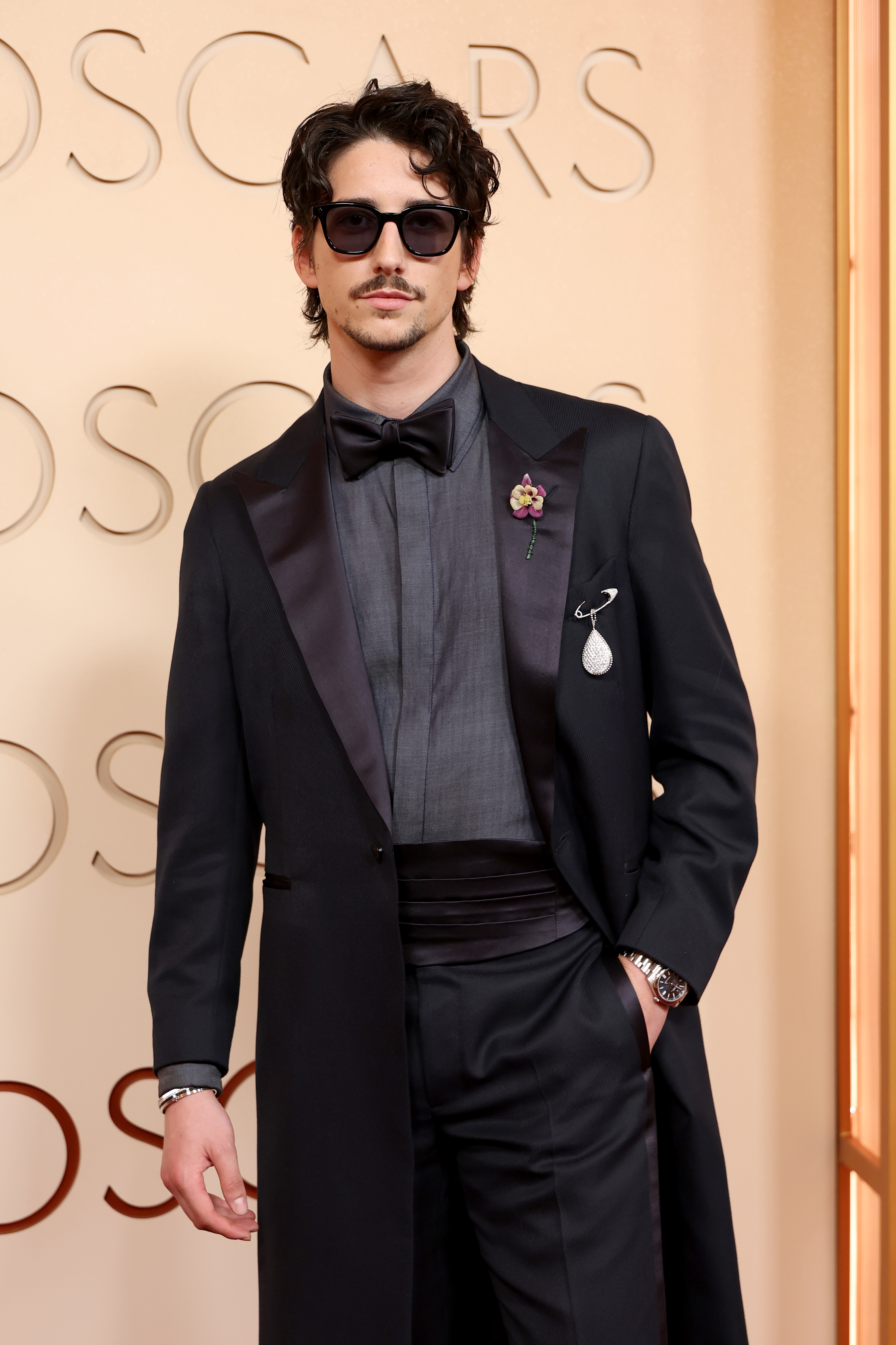 Leonardo DiCaprio, nominated for One Battle After Another, wore a classic black tuxedo by Dior, styled with a white shirt, black bow tie, and patent leather shoes. He completed the look with a vintage bee brooch from Boucheron’s private collection, crafted in 1964 in yellow gold, enamel, garnet, and diamonds, adding a subtle nod to nature-inspired design. Courtesy of Dior & Bourcheron