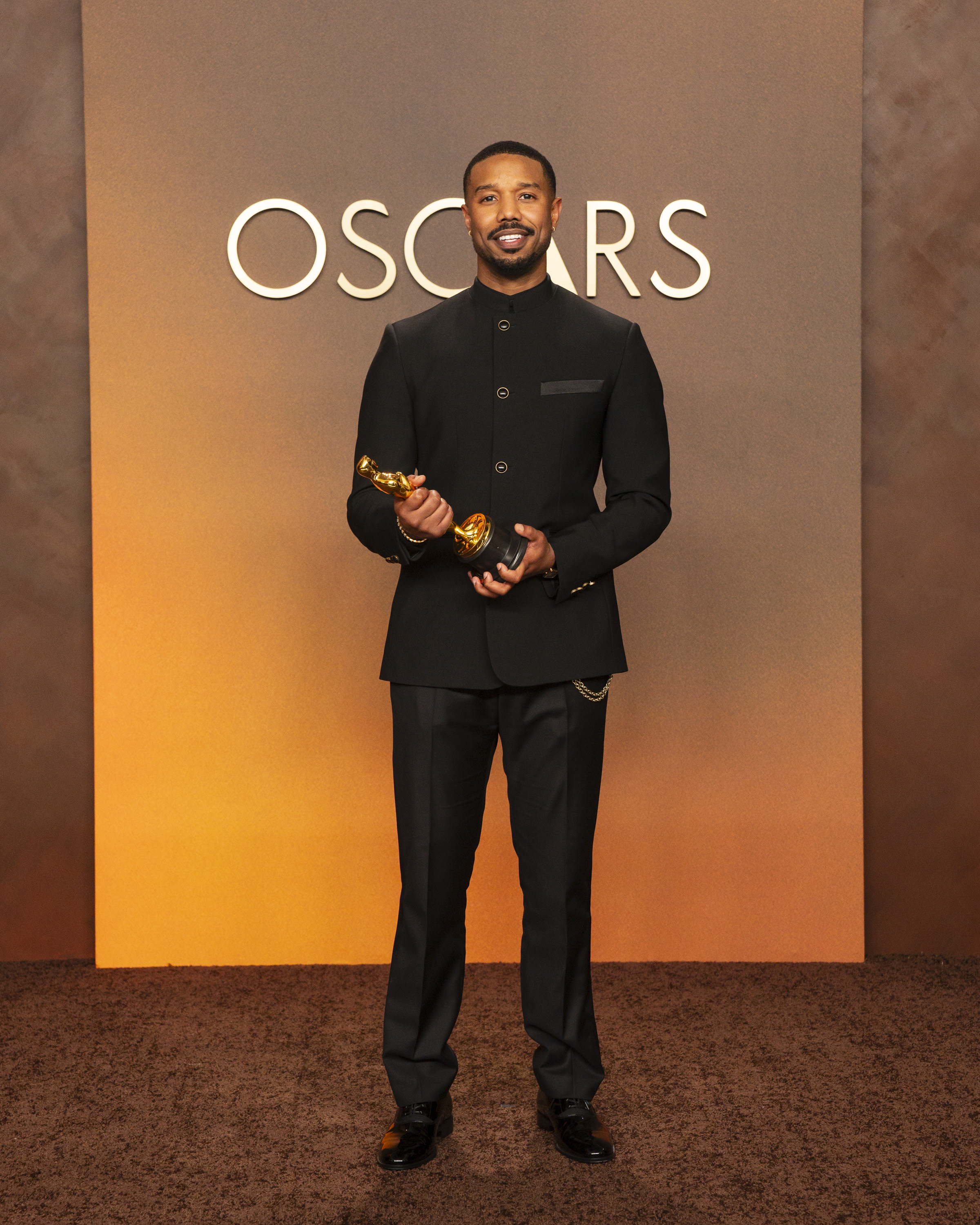 Michael B. Jordan wore a Louis Vuitton black officer-collar wool jacket with silk satin details and black-and-gold logo buttons, paired with matching straight tuxedo trousers, a white poplin shirt, and black patent LV Première Oxford shoes. Courtesy of Louis Vuitton