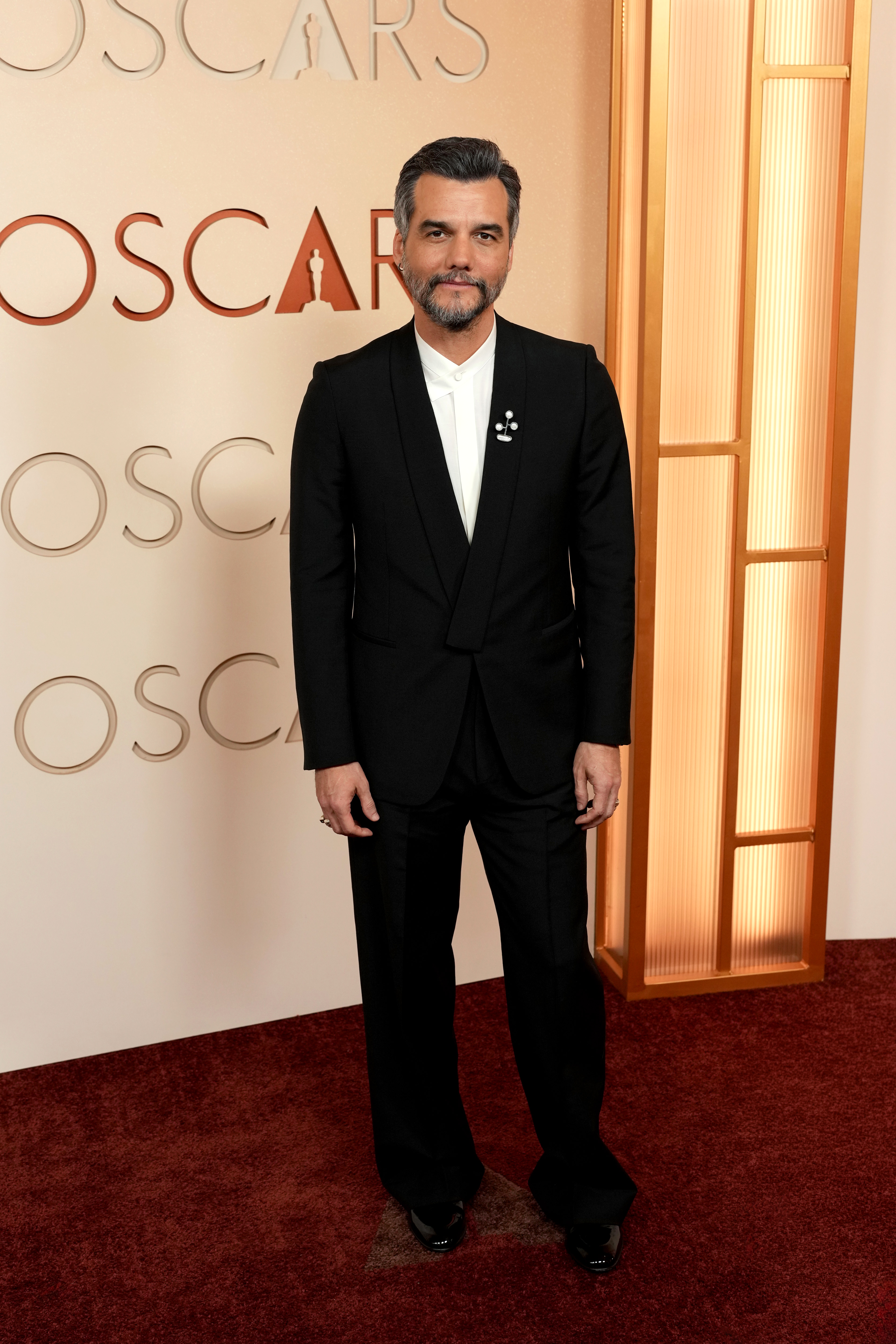 Moura wears a ZEGNA 2026 Red Carpet Collection black wool peak lapel tuxedo, white covered buttons silk shirt, black bowtie and black Vienna Evening shoes. Courtesy of ZEGNA