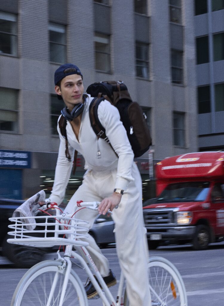 Fluid twill classic fit shirt and pure silk double pleat pant TOM FORD | Heritage sling back hat TOMMY HILFIGER | Tank Louis Cartier watch CARTIER | Re-nylon backpack PRADA | AirPods Max in Midnight APPLE | Shoes SPERRY