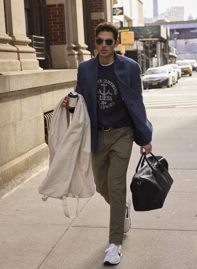 Jacket BERLUTI | Logo crew sweater GUESS | T-shirt CALVIN KLEIN | Cotton military pants BROOKS BROTHERS | Sunglasses RAY-BAN | Leather runway belt and compass bag COACH | Sneakers NIKE