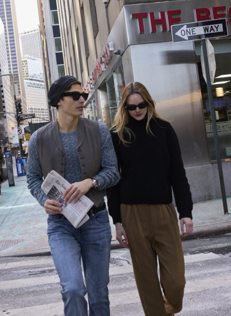 Cashmere shawl collar vest and cashmere long sleeve crewneck sweater GIORGIO ARMANI | Jeans 7 FOR ALL MANKIND | Cotton beret PAUL SMITH | Sunglasses RAY-BAN Luminor BiTempo Power Reserve Polished steel bezel | Black Alligator strap PANERAI | Textured leather belt THE TIE BAR