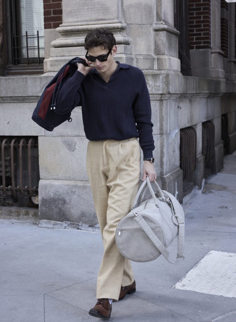 Cotton rib knit polo BRUNELLO CUCINELLI | Linen pleated trousers TODD SNYDER | Sunglasses RAY-BAN | De Ville Prestige 41 mm watch OMEGA | Cotton heritage sling bag TOMMY HILFIGER | Zaffiro plain toe oxfords FLORSHEIM | Stylist’s own duffle bag