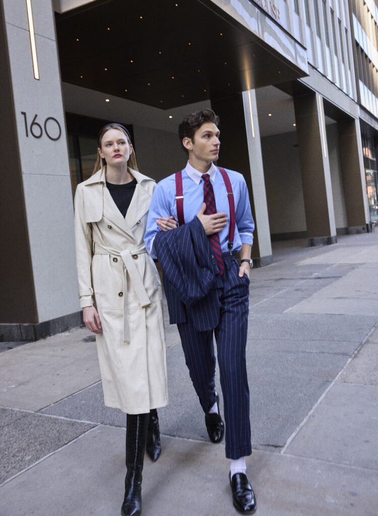 Suit RALPH LAUREN PURPLE LABEL | Cotton regular-finish tab collar shirt and silk tie BROOKS BROTHERS | Silk burgundy loop suspenders THE TIE BAR | Waterbury heritage chronograph leather strap watch TIMEX | Cotton rib knit socks BRUNELLO CUCINELLI | Leather shoes GIANVITO ROSSI