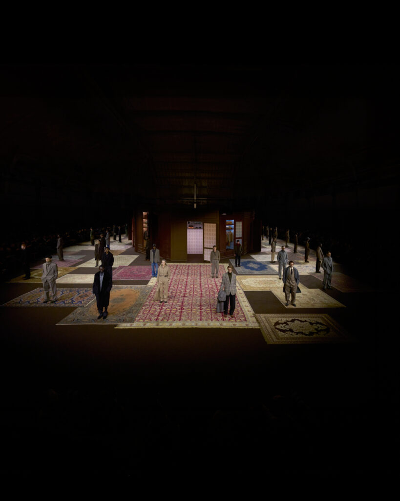 Though the variety of suits, sweaters, and slacks don’t venture far past Zegna’s typical muted color palette, textures and contrasting knits tell an interesting story and allow for more versatility of wear. Even the double-breasted jacket can evolve behind past its classic silhouette — a horizontal button allows for two different styles, one more closed-off and tailored and the other more loose and open. Additional layered collars also give a feeling of both nostalgia and the modern take on layering with built-in double collars. Celebrity guests like actor Lee Byung Hun modeled the newest take on the Zegna legacy while sitting front row of the presentation.